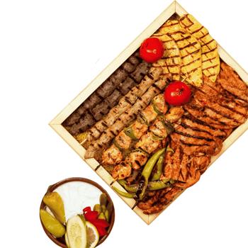 عدد 2 سيخ كفتة لحم + 2 سيخ كفتة دجاج + 2 سيخ شيش طاووق + 4 قطع دجاج مسحب (مشوي عالفحم) + 3 قطع دجاج صدور هاواي تقدم مع : الارز + ثومية + طحينة + مخلل + بطاطس + سلطة خضراء + خبز